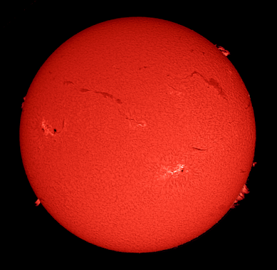 An Opticstar PL-130M monochrome CMOS 1.3 mega-pixel USB camera was used to capture two 1500 frame AVIs at 8fps using a Solarmax ll 60 BF15 H-alpha scope. One AVI was exposed for the solar disk and the second AVI was exposed for the prominences. The AVIs were stacked in Registax 5 and the resulting images were combined in Photoshop. Full details at: http://x-bit-astro-imaging.blogspot.co.uk/ Click on the image to get a closer view