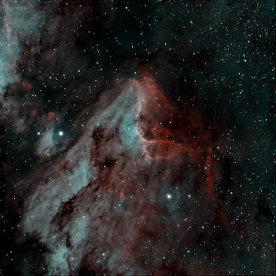One hour's worth of 5 minute exposures of the Pelican nebula captured with AstroDMx Capture through a William Optics 81 mm ED APO refractor with an Altair Hypercam 533C 14 bit OSC CMOS camera with an Altair quadband filter. Rendered as a RGB image and a HOO type rendering.